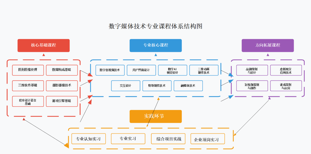 专业核心课程:数字音视频技术、用户界面设计、数字AI视觉设计、三维动画制作技术、交互设计、特效制作技术、融媒体技术等课程