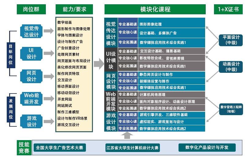 课程体系对标行业岗位需求,核心课程与职业技能等级证书考核内容精准对接。学生可考取数字媒体设计师、动画设计师、UI/UX 设计师、新媒体运营师等权威证书,获证率与就业竞争力同步提升。同时,以赛促学成效显著,师生积极投身全国大学生广告艺术大赛、江苏省大学生计算机设计大赛、数字化产品设计与开发等各级各类赛事,捷报频传。教师斩获优秀指导教师等荣誉,学生作品获评省级优秀等次,累计揽获省市级以上奖项数十项,实现师生竞赛成果双丰收。
