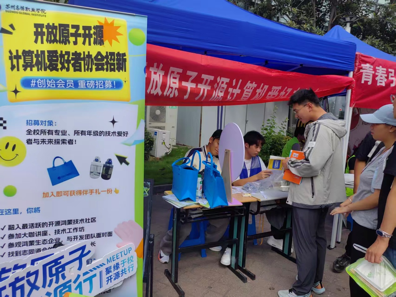10月15日至16日,为期两天的苏州高博职业学院“开放原子校源行计算机爱好者协会”2025年招新活动,在校园广场主招新点圆满落下帷幕。活动紧扣“开源技术实践与文化传播”核心,以丰富的互动形式、扎实的成长福利,吸引了大批在读学子参与,最终成功吸纳众多热爱技术的新成员,为社团发展注入强劲新生力量。