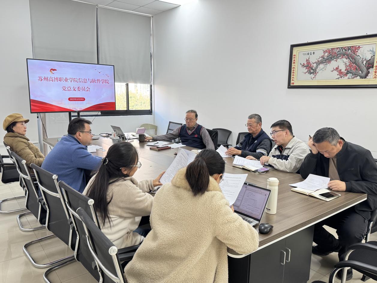 为深入学习贯彻党的二十届四中全会精神,统筹推进学院“十五五” 规划编制、民主管理及党建工作提质增效,2025年11月19日14时,苏州高博职业学院信息与软件学院(以下简称“信软学院”)在14号楼306会议室召开党总支委员会。党总支书记周肖兴主持会议,党总支全体委员参会,孟丽、王咏梅、黄昕同志列席。