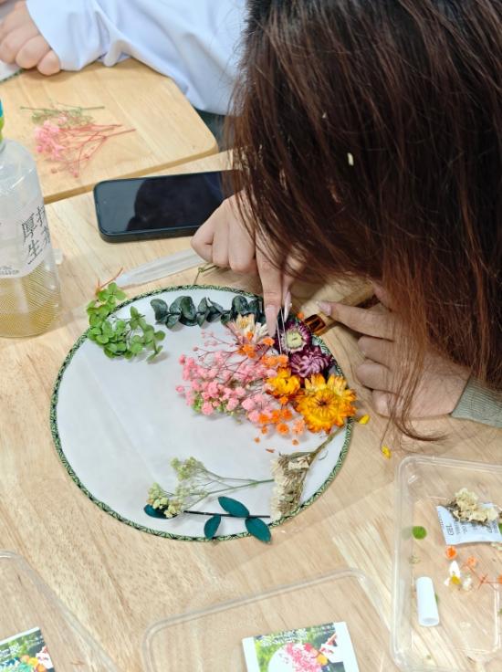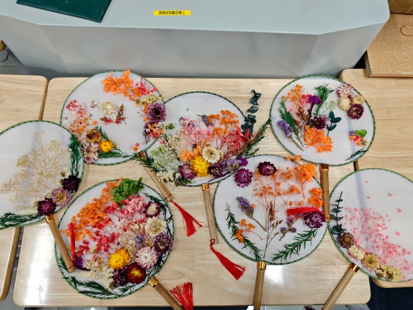 手工制作环节,同学们精心挑选干花材料,发挥巧思搭配造型,亲手制作专属干花团扇,同时在扇面写下感恩心语与成长誓言,以扇寄情、以花表意。大家沉浸于手工创作,既感受创意制作的乐趣,又进一步深化对资助政策的理解,筑牢感恩自强、奋进成长的理想信念。完成的团扇,同学们可自主选择自留纪念,或是捐赠致敬后勤工作人员,传递暖心善意。